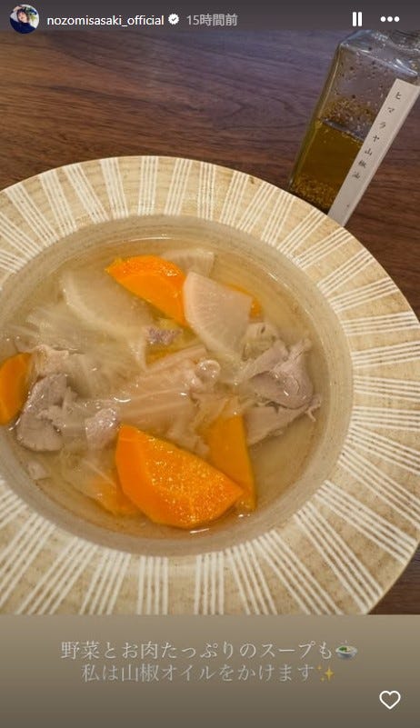 佐々木希、手作り“金目鯛の煮付け”披露 スープも紹介「私は山椒オイルをかけます」