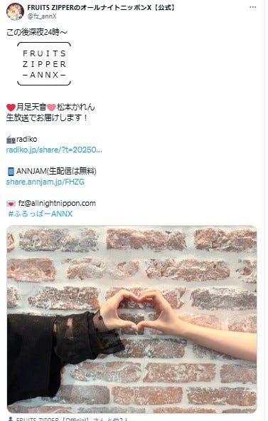 「FRUITS ZIPPERのオールナイトニッポンX(クロス)」公式Xより