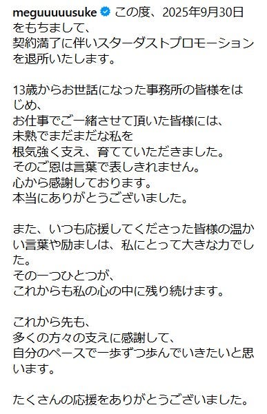 佐藤めぐみ、スターダストプロモーション退所を報告「金八」「花男」ほか話題作出演【全文】