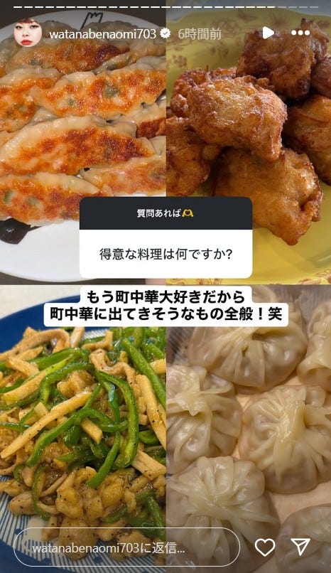 お笑いタレントの渡辺直美が4日、自身のInstagramストーリーズを更新。手作りの中華料理を公開し...