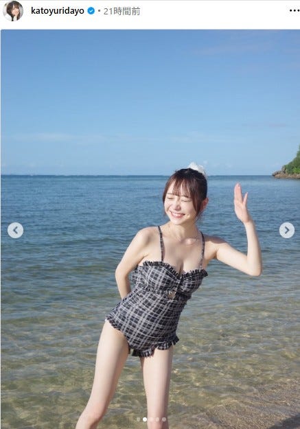 かとゆり、胸元&美脚のぞく水着姿公開「セクシー」「旦那さん撮影かな?」と反響