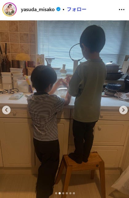 タレントの安田美沙子が10月7日、自身のInstagramを更新。息子2人と白玉団子を作る様子を公開...