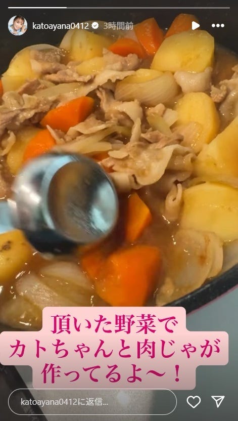加藤茶の妻でタレントの加藤綾菜が10月10日、自身のInstagramストーリーズを更新。肉じゃがを...