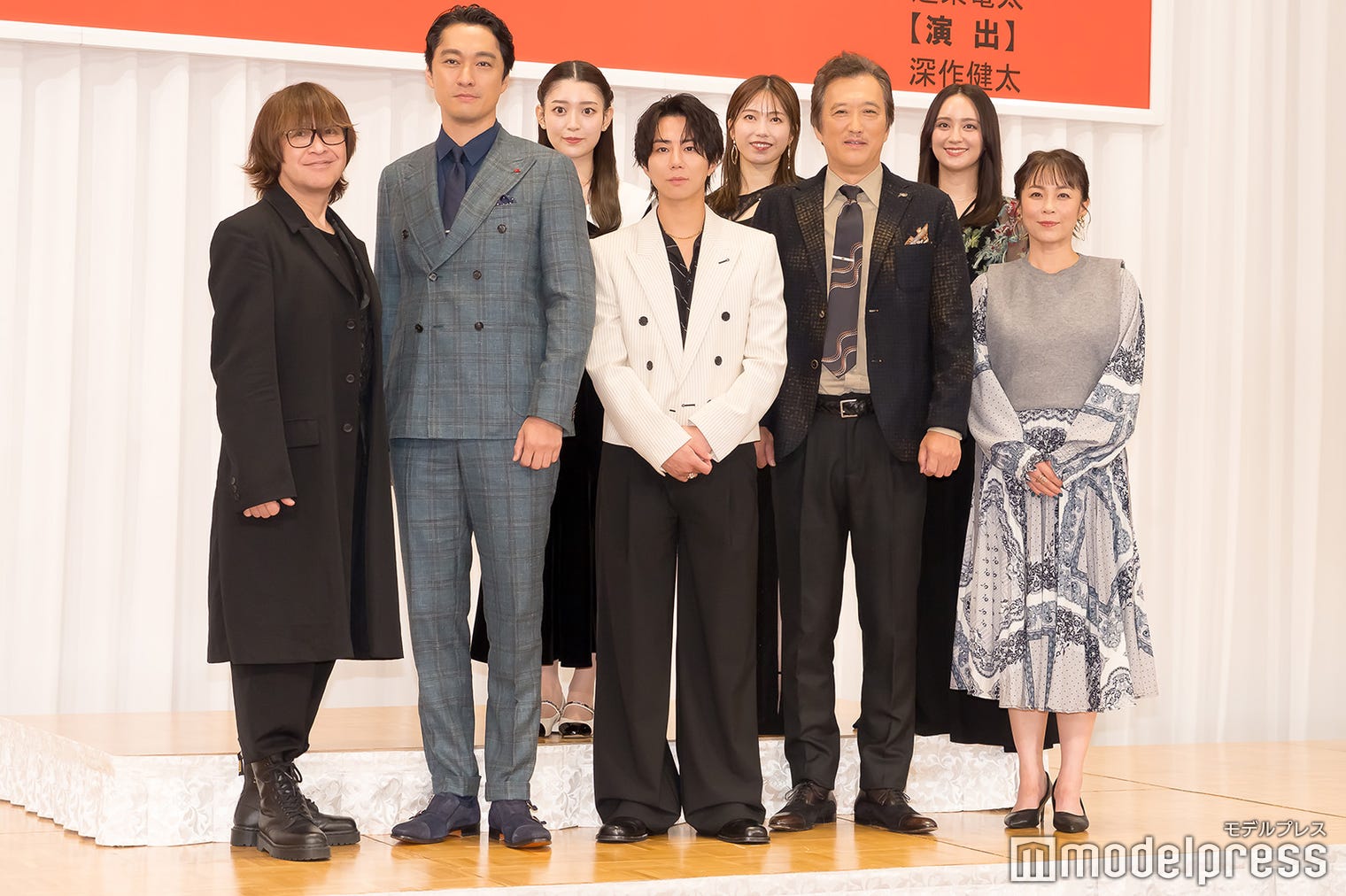 (後列左から)阪口珠美、横山由依、岡田結実 (前列左から)深作健太氏、渡辺大、北山宏光、大鶴義丹、佐藤仁美 (C)モデルプレス