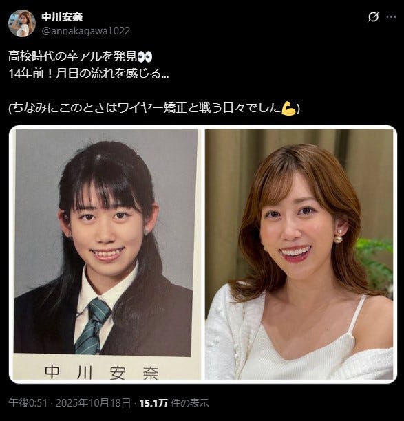 中川安奈アナ、高校の卒アル写真公開「初々しい」「より綺麗になってる」と反響