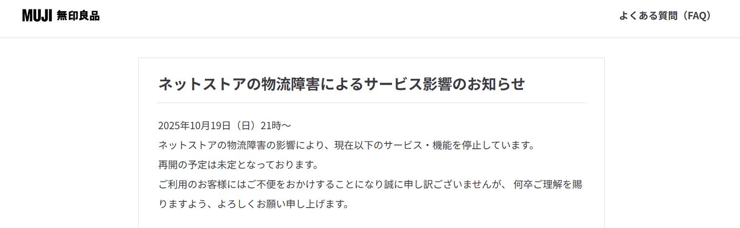 良品計画「無印良品」物流障害の影響で一部サービス停止 再開は未定