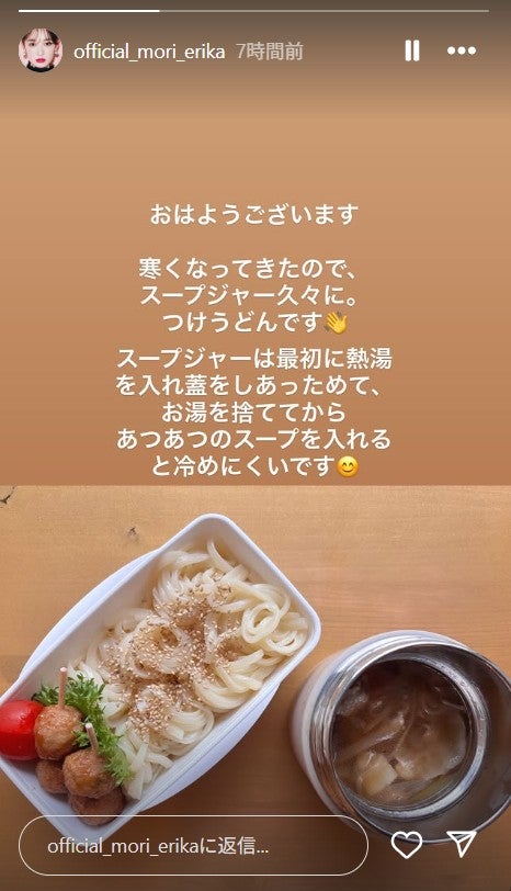 森絵梨佳「寒くなってきたので」スープジャー使った弁当公開 “冷めにくい”コツ明かす「真似したい」「愛情たっぷり」