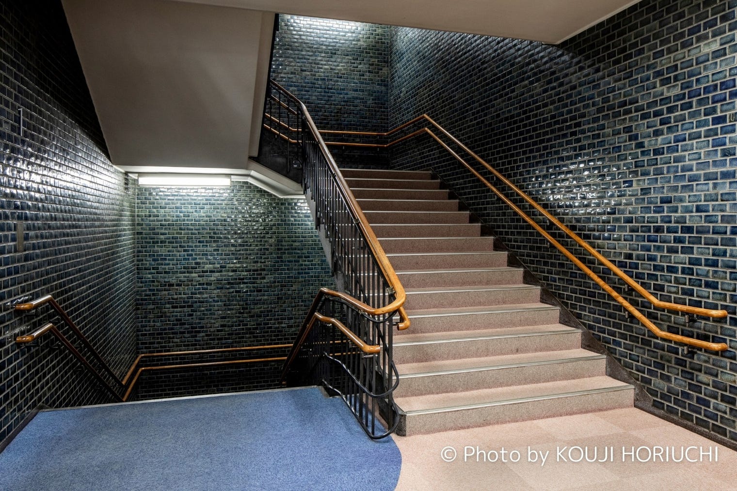 旧市庁舎内の艶のある青い磁器質タイル(提供写真)