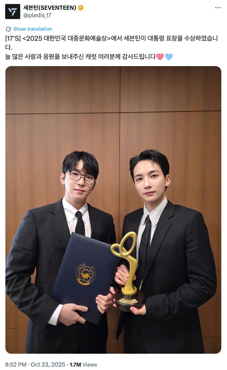 13人組グループ・SEVENTEEN(セブンティーン)のX(旧Twitter)が2025年10月23...