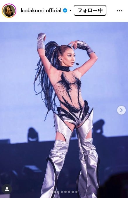 歌手の倖田來未が、10月23日に自身のInstagramを更新。ボディが透けるステージ衣装での姿を公...