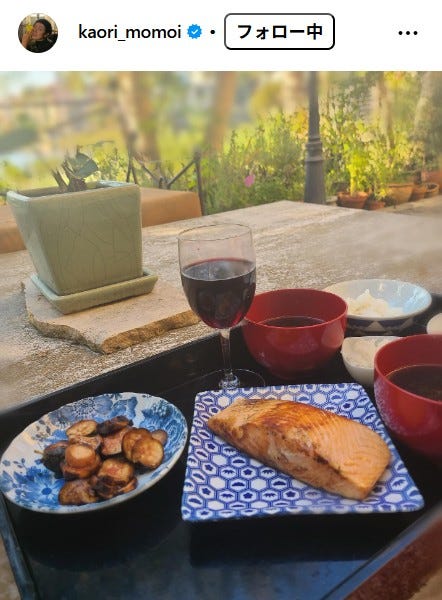 桃井かおり「庭で鮭定食」自然光で楽しむ食事が話題「おしゃれ」「LAで和定食最高」