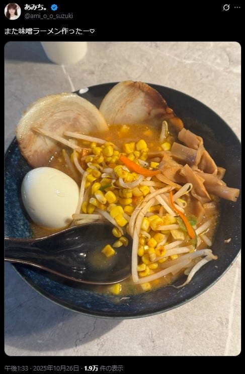 人気TikTokerのあみち。が10月26日、自身のX(旧Twitter)を更新。手作りの味噌ラーメ...