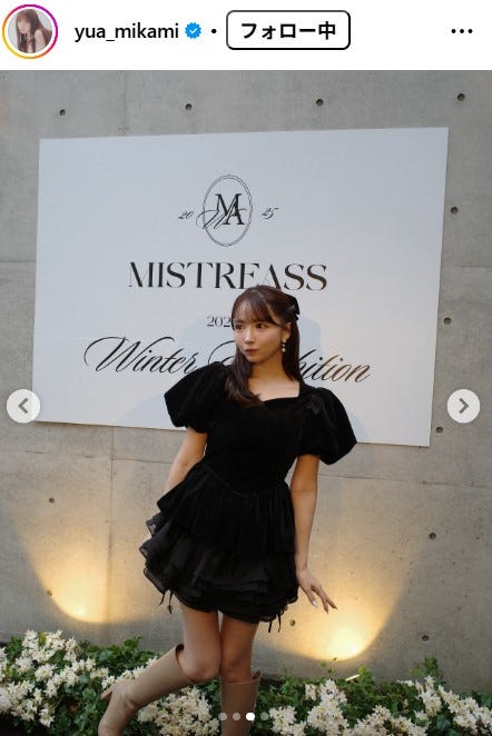 タレントの三上悠亜が10月27日、自身のInstagramを更新。ミニワンピース姿で美しい脚を披露し...