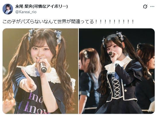 9人組アイドルグループ・可憐なアイボリーの永尾梨央が10月21日、自身の公式X(旧Twitter)を...