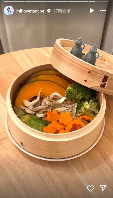 元日向坂46で女優の渡邉美穂が27日、自身のInstagramストーリーズを更新。彩り豊かな蒸し料理...