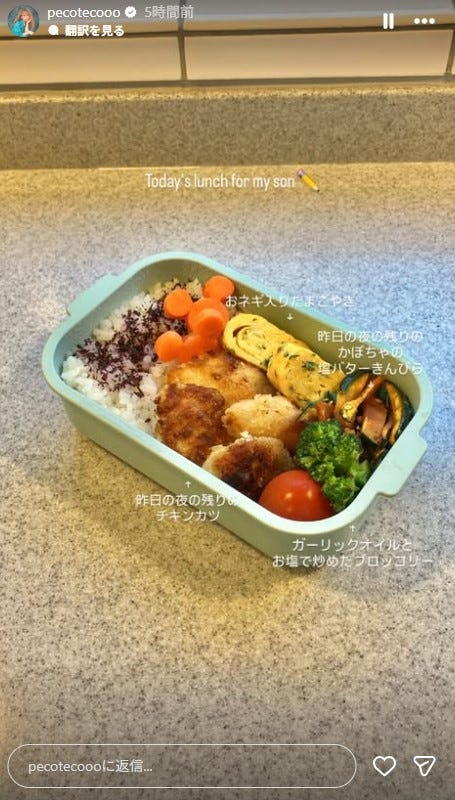 タレントのpecoが11月4日、自身のInstagramストーリーズを更新。息子に作った手作りランチ...
