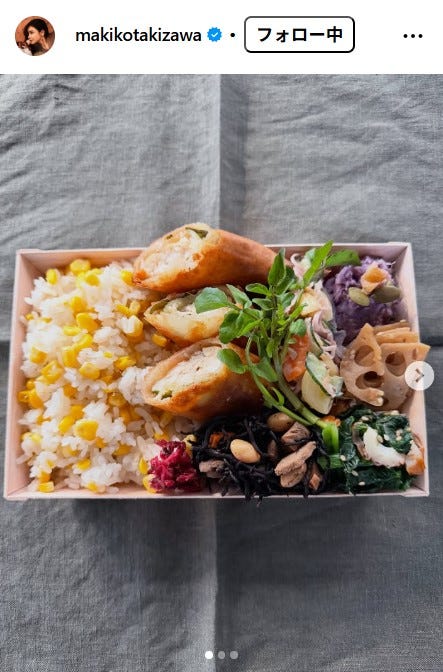 モデルの滝沢眞規子が11月4日、自身のInstagramを更新。夫の好物入り手作り弁当を公開した。
