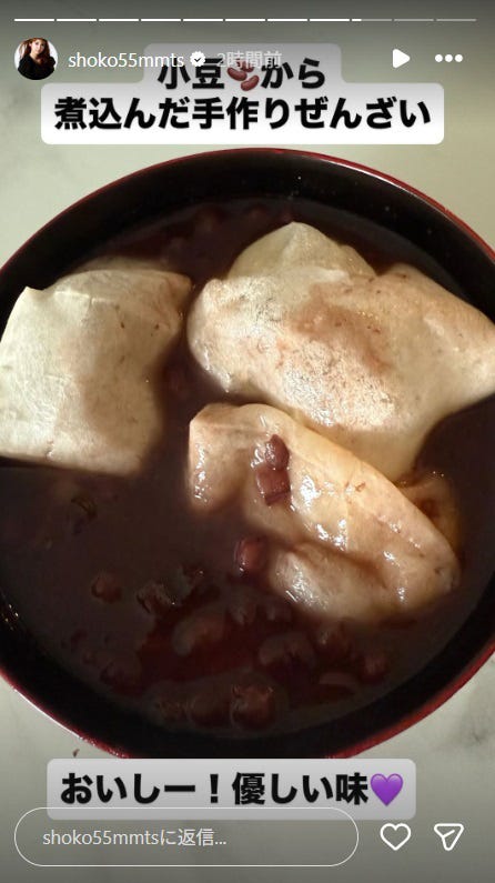 タレントの中川翔子が11月4日、自身のInstagramストーリーズを更新。手作りぜんざいを公開し、...
