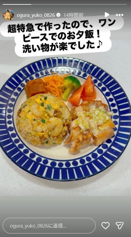 タレントの小倉優子が11月7日、自身のInstagramストーリーズを更新。夕飯を公開し、反響が寄せ...