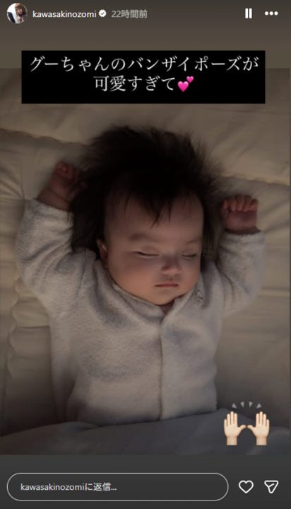 実業家でタレントの川崎希が11月9日、自身のInstagramストーリーズを更新。次女の寝姿を公開し...