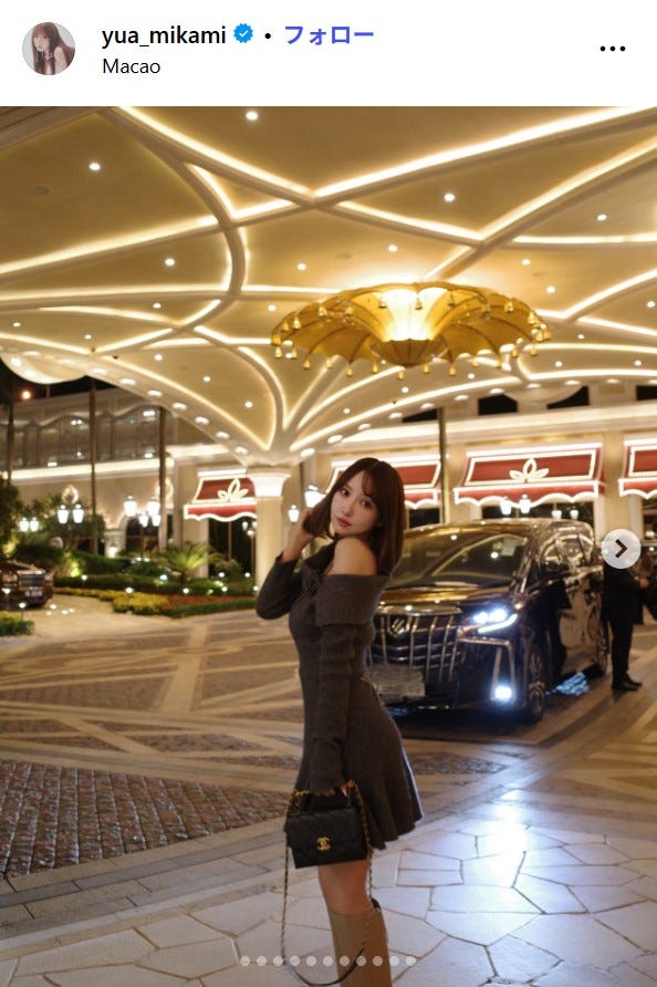 タレントの三上悠亜が11月10日、自身のInstagramを更新。マカオの豪華ホテルでのショットを公...