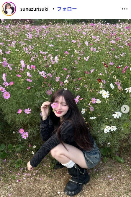 インフルエンサーのすなずりかりんが11日、自身のInstagramを更新。福岡でのコスモス畑での写真...