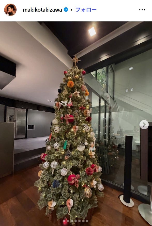 モデルの滝沢眞規子が11月13日、自身のInstagramを更新。自宅のクリスマスツリーを公開した。