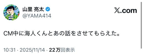 お笑いコンビ・南海キャンディーズの山里亮太が14日、自身のX(旧Twitter)を更新。King &...