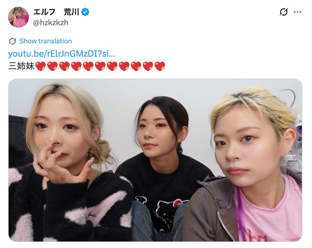 お笑いコンビ・エルフの荒川が11月13日、自身のX(旧Twitter)を更新。妹との「3姉妹」写真を...