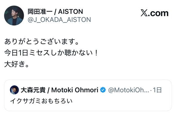 ミセス大森元貴、岡田准一との公開やり取りに反響相次ぐ「お互いファン状態でほっこり」「オタク化してて可愛い」
