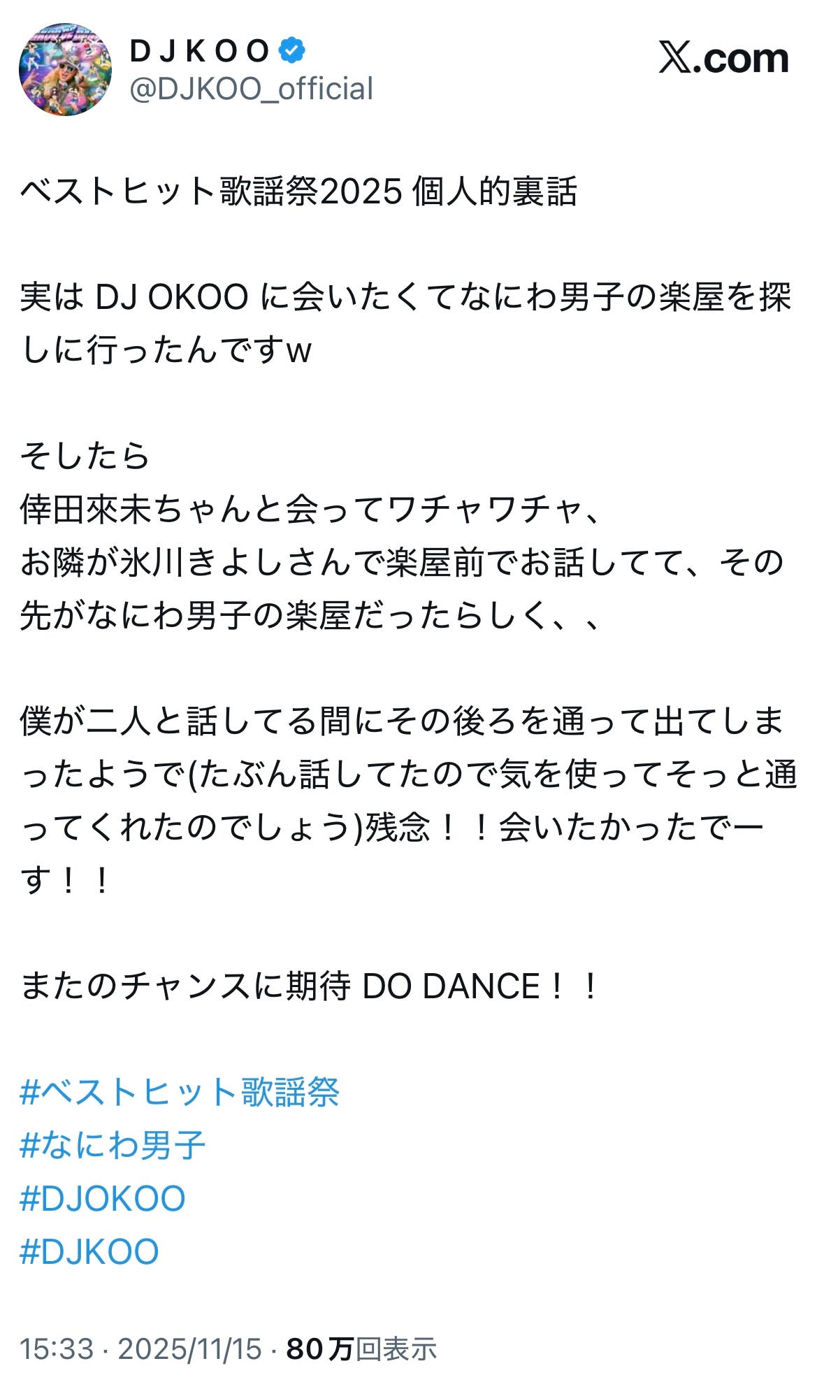 DJ KOO「ベストヒット歌謡祭」なにわ男子の裏話告白「DJ OKOOに会いたくて…」