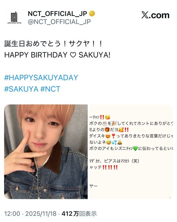 NCT WISHサクヤ、ファンへ“おじさん構文”でメッセージ 誕生日投稿が話題「完璧に使いこなしてる」「韻も踏んでて感動」の声