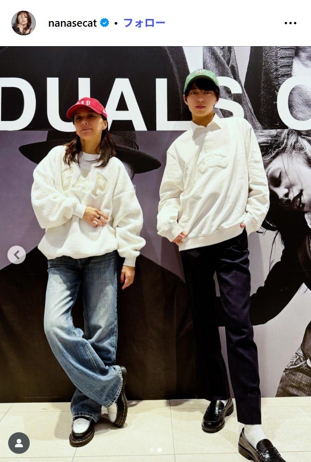 相川七瀬、イケメン息子とのリンクコーデ披露「2人とも脚長すぎ」「絵になる親子」と反響