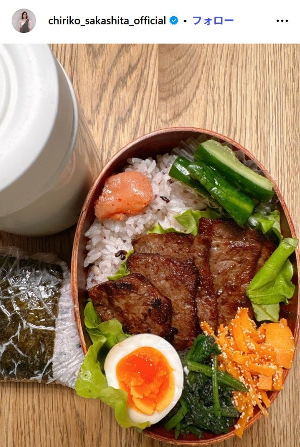 タレントの坂下千里子が11月26日、自身のInstagramを更新。娘に作った焼肉弁当を公開した。