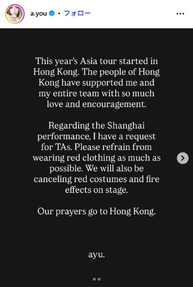 浜崎あゆみ、香港の大規模火災受けファンに呼びかけ 上海公演で衣装・演出変更へ