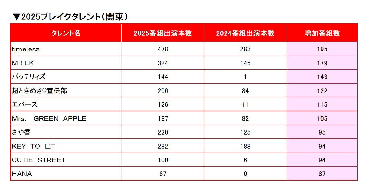 2025年1月~11月のテレビ番組出演者データを基にした『2025タレント【関東・関西】番組出演本数...