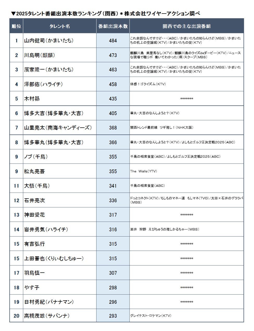 2025年1月~11月のテレビ番組出演者データを基にした『2025タレント【関東・関西】番組出演本数...