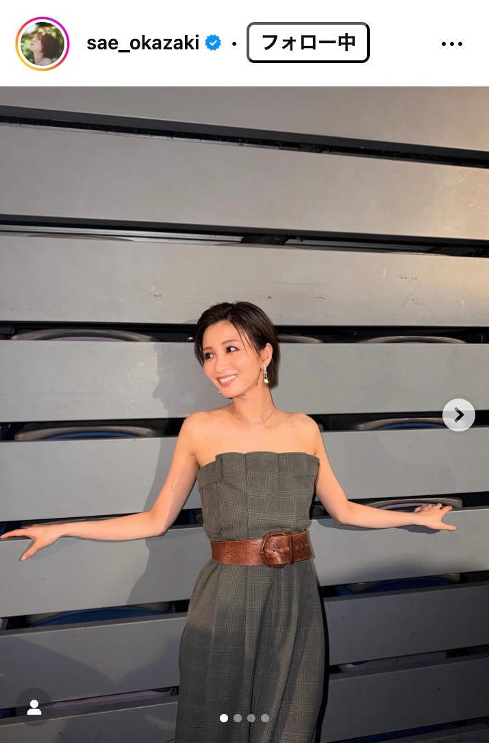 モデルで女優の岡崎紗絵が12月6日、自身のInstagramを更新。ベアトップのパンツスーツ姿を公開...
