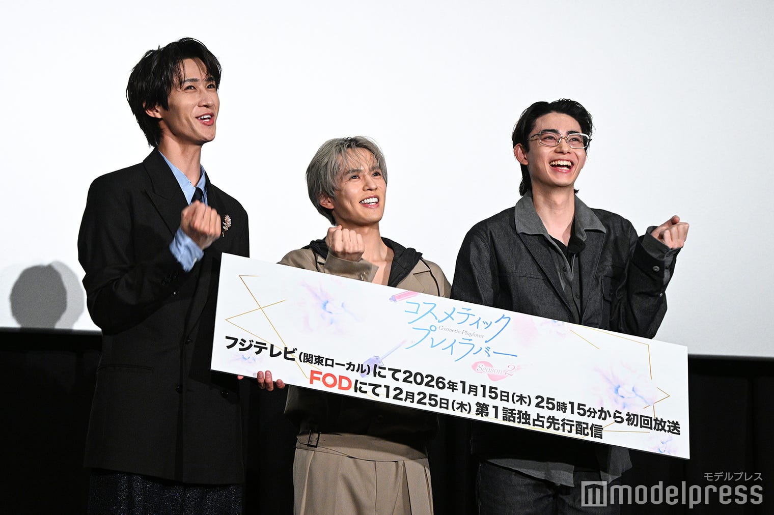 俳優の奥野壮、豊田裕大、M!LKの曽野舜太が12月9日、都内で行われたドラマ「コスメティック・プレイ...