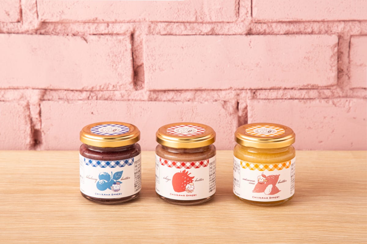 ジャム(ちいかわのいちごバター/ハチワレのブルーベリーバター/うさぎのさつまいもバター)各税込950円(C)nagano