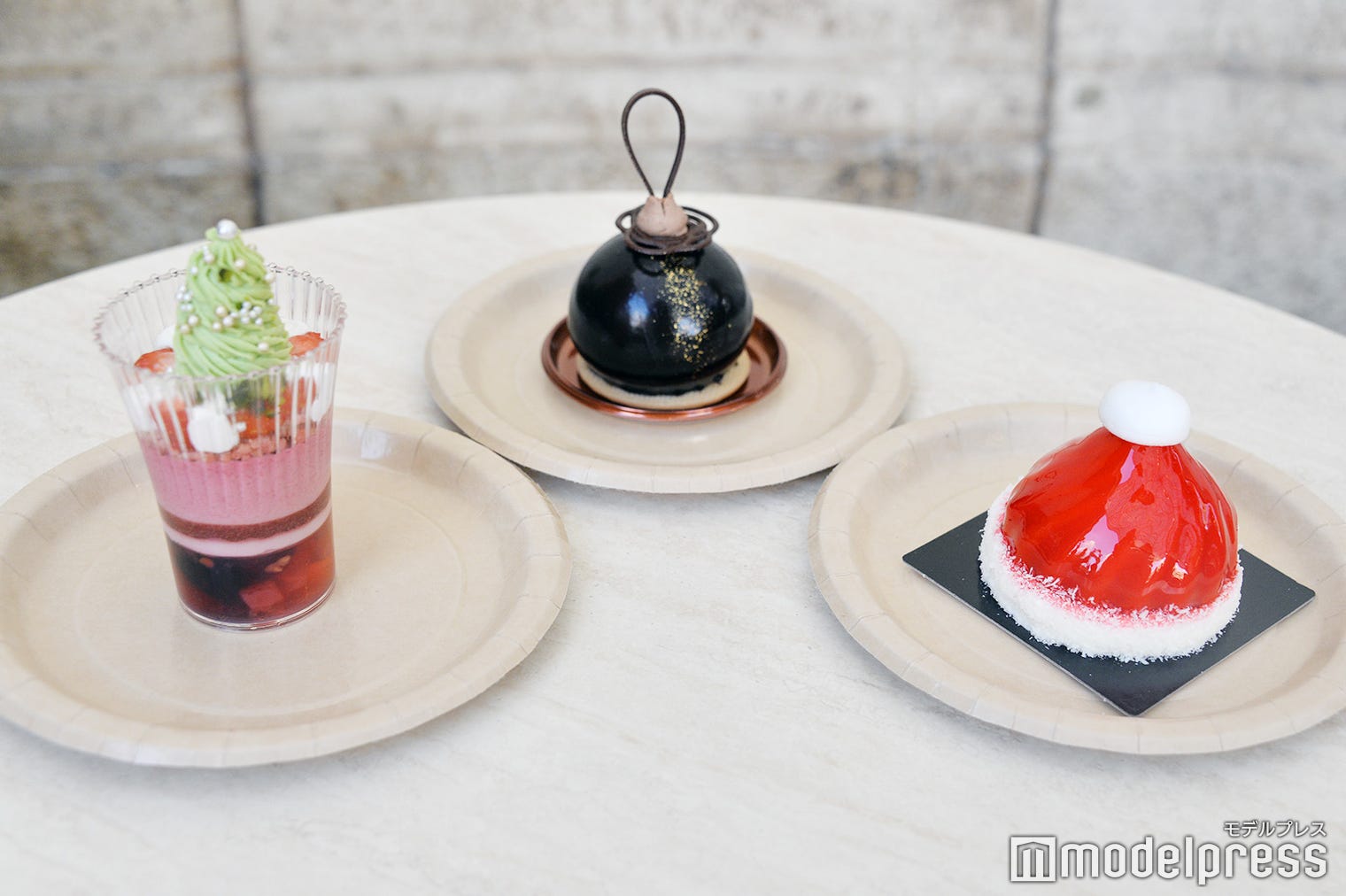(左)クリスマス・パフェ~ベリー&ピスタチオ~¥900(中)ムース・オ・ショコラ~オランジェ&カルダモン~¥950(右)サンタクロース~キャラメル&ラズベリー~¥900(C)モデルプレス
