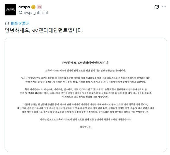 SMエンタ、aespaウィンターへの誹謗中傷に法的対応を告知「寛大な対応はせず厳正に対処する予定」