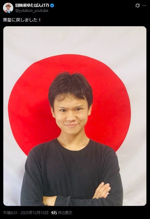 YouTuberのゆたぼんが12月15日、自身のX(旧Twitter)を更新。印象をガラリと変えた近...