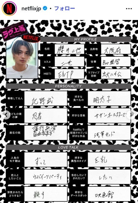 Netflixヤンキー恋リア「ラヴ上等」メンバーの直筆プロフ公開 個性爆発で話題沸騰「文字のギャップすごい」「モザイクされてるの初めて見た」