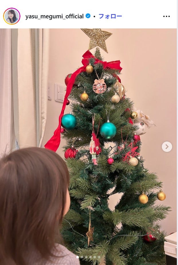 タレントの安めぐみが12月19日、自身のInstagramを更新。自宅に飾ったクリスマスツリーを公開...