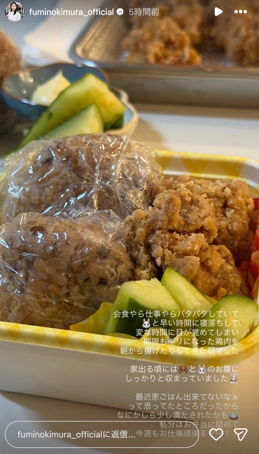 女優の木村文乃が12月22日、自身のInstagramストーリーズを更新。自分用に用意した手作り弁当...