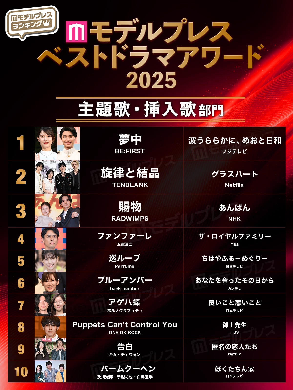【モデルプレス ベストドラマアワード2025】「主題歌・挿入歌」部門トップ10(C)モデルプレス