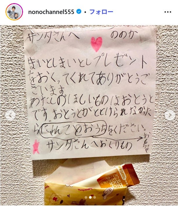 “ののちゃん” 村方乃々佳、サンタさんへの直筆手紙話題 お願いしたものに 「凄いの頼んでる」「純粋でピュア」の声