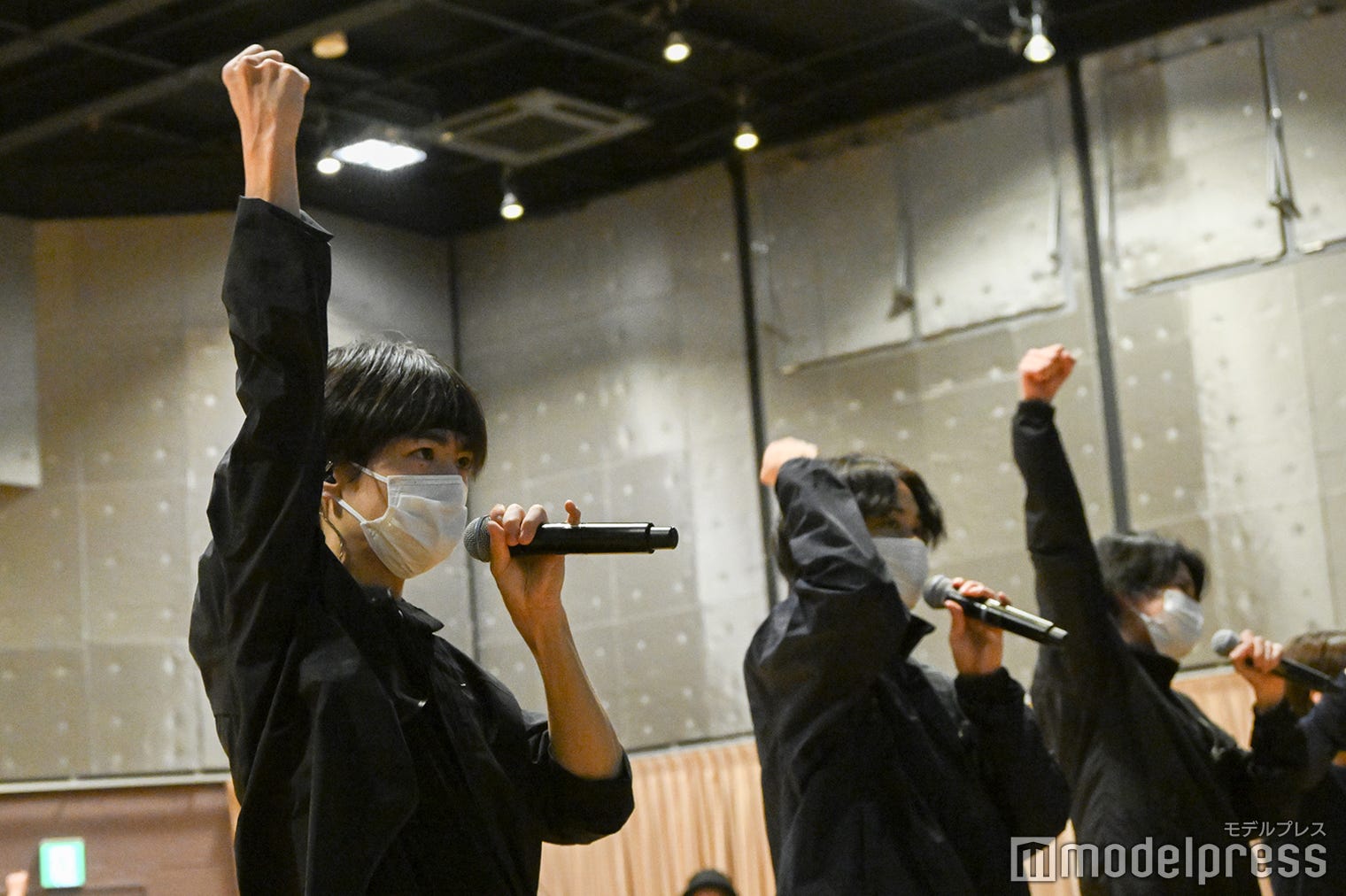 8. リハーサル合間に取材に応じてくれた溝口琢矢、甲斐翔真、細田佳央太/モデルプレスの「M」ポーズ(C)モデルプレス