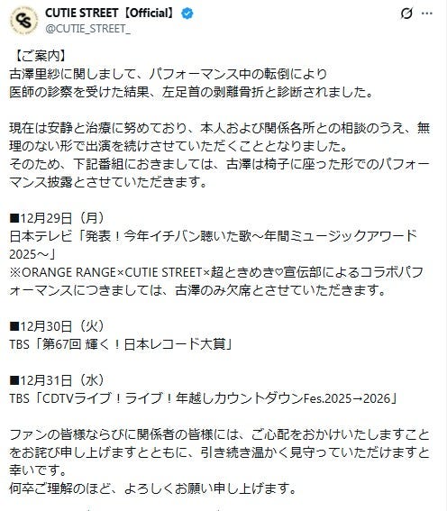 CUTIE STREET古澤里紗、ライブ中転倒で左足首剥離骨折 年内歌番組は「椅子に座った形でのパフォーマンス披露」